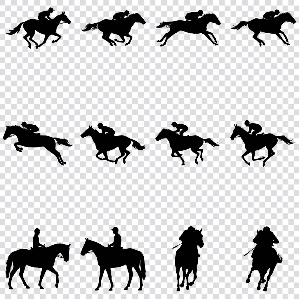 It features 12 dynamic jockey silhouettes, showcasing riders in action-packed poses — from high-speed gallops and mid-jump stances to poised walking and cantering positions. Each silhouette captures the harmony between rider and horse, perfect for celebrating the spirit of thoroughbred racing and equestrian sport.