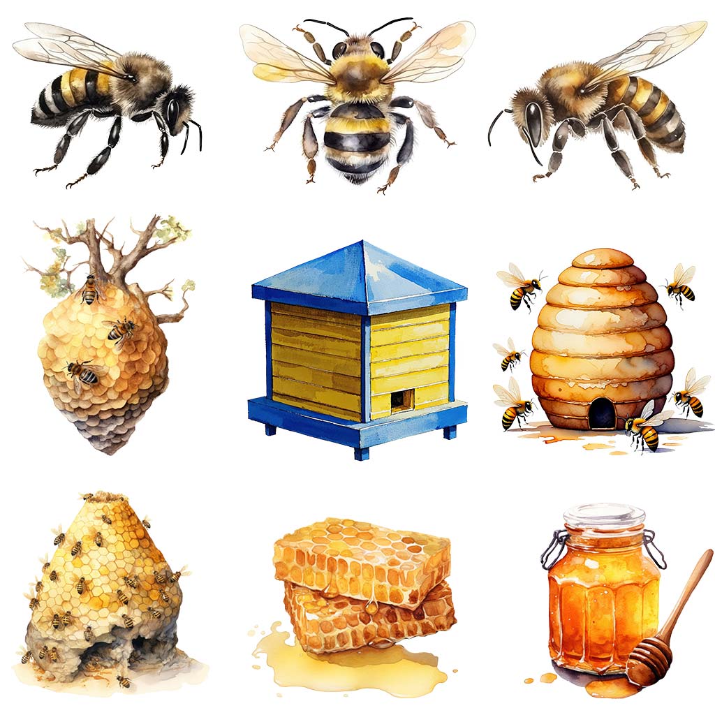 This delightful collection features 18 detailed watercolor clipart of honey bees, hives, honeycombs, and jars of golden honey — each rendered with soft brushwork, natural textures, and warm earthy tones. From close-up views of buzzing bees in flight to rustic beehives and glistening honeycomb stacks, these illustrations capture the essence of beekeeping, eco-conscious living, and cottagecore charm.