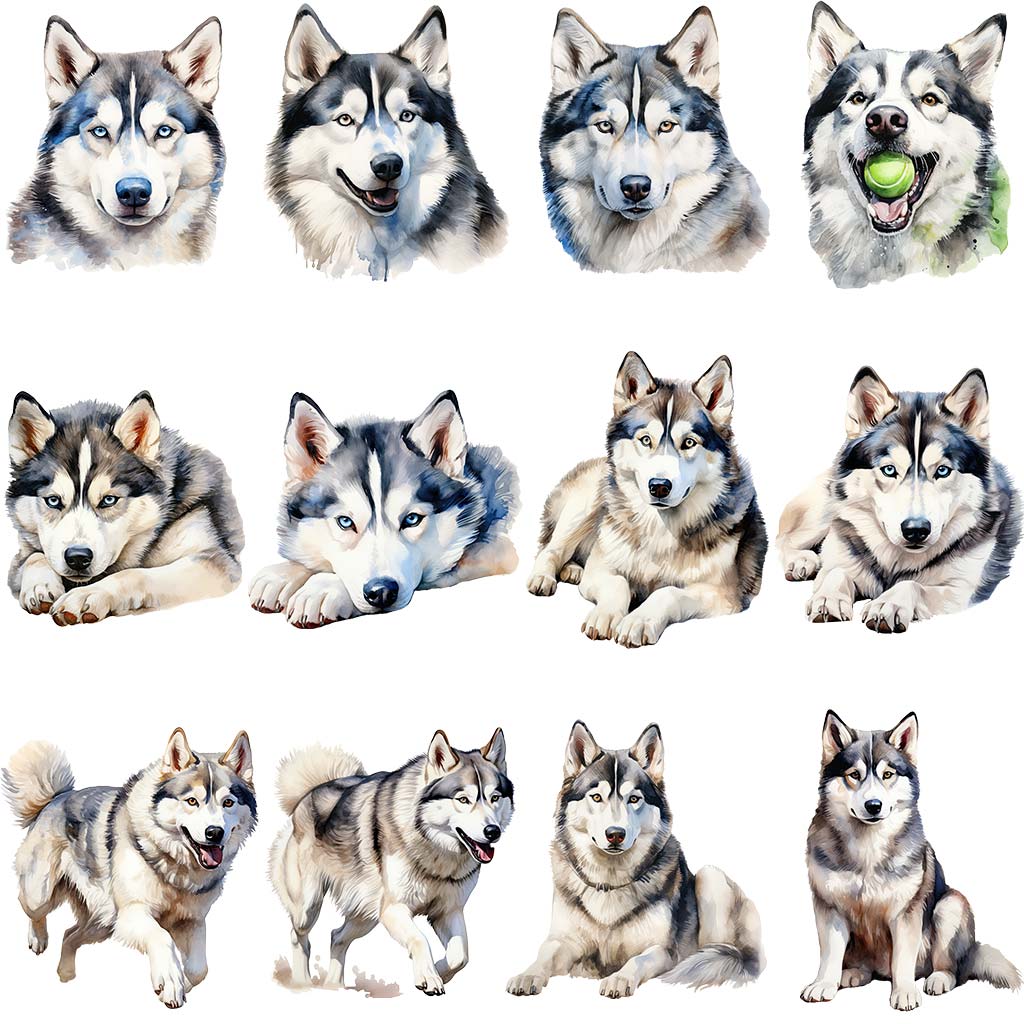 A must-have for dog lovers, winter-themed creators, and anyone who adores the striking beauty and spirited soul of the Siberian Husky — each portrait painted in expressive, hand-blended watercolor with piercing blue or amber eyes, fluffy coats, and playful energy.